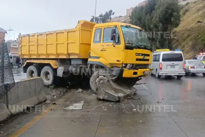 Durante la jornada de este sábado, bajo una persistente lluvia, una volqueta protagonizó un hecho de tránsito al colisionar con un minibús y destrozar los bloques de concreto que dividen los carriles en la autopista que vincula las ciudades de La Paz y El Alto.