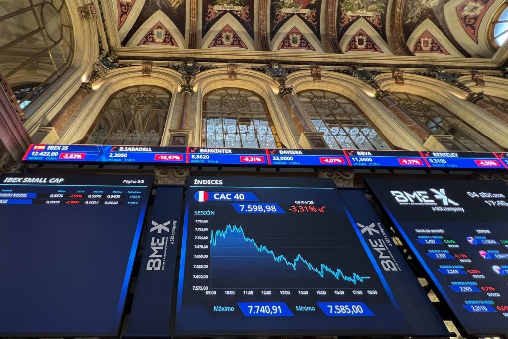 El CAC 40, afectado por segunda sesión consecutiva por el huracán generado por los aranceles de EE.UU. y por la reacción china de hoy, cerró en 7.274,95 puntos, con lo que ha perdido más de un 7 % en dos días y ha borrado todas sus ganancias desde principios de año.